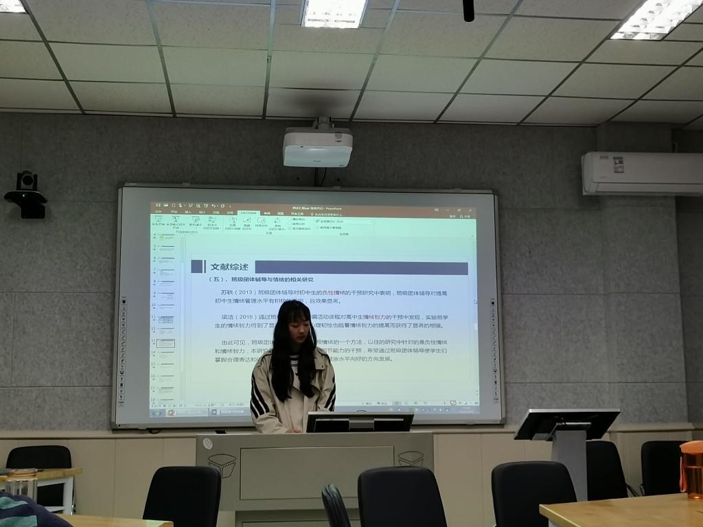 本次汇报中,张竞月同学基于国家有关部门提出的《关于加强心理健康服务的指导意见》和《中小学心理健康教育指导纲要》,阐述了自己的研究主题:通过班级团体辅导的干预来增强学生的情绪调节能力,使学生学会合理表达和控制自己的情绪,让心理健康水平得以提升。首先,张竞月同学介绍了情绪调节和团体辅导的相关概念。随后张竞月同学提到了理论依据:团体动力学理论和社会学习论,并介绍了国内相关研究成果。之后,张竞月同学呈现了自己的研究方法:前后测准实验设计。最后,张竞月同学呈现了自己的团体辅导设计流程和研究假设。