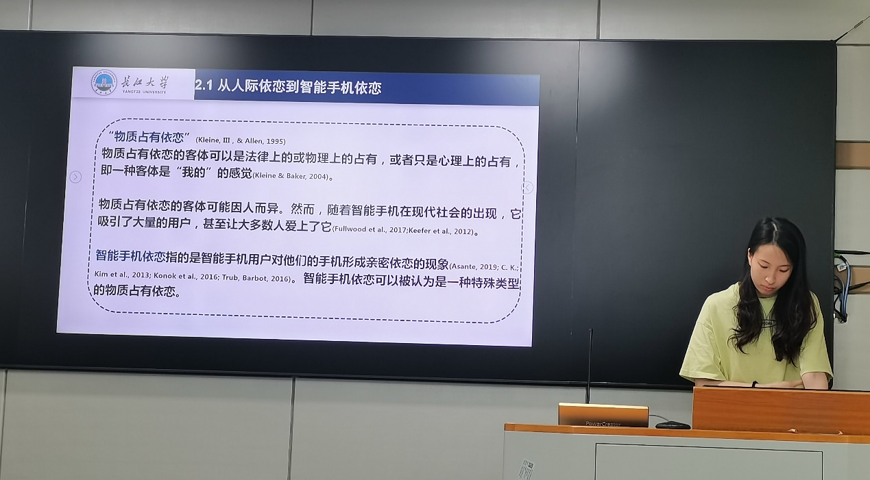 例会正式开始,首先由曹晓萱同学进行文献汇报,题目为《Why can’t we be separated from our smartphones? The vital roles of smartphone activity in smartphone separation anxiety》,该文章于2020年发表在《Computers in Human Behavior》杂志上。该文章基于网络时代的大背景,指出智能手机为人们的日常生活提供了许多便利,因此成为了人们一种有价值的附属物。而过度依恋智能手机可能会产生负面的心理影响,例如担心与智能手机分离。据此,该研究通过强调手机本身的独特性和活动的重要性来检验移动活动对智能手机分离焦虑的影响。研究调查了1733名中国年轻人在无法进行移动活动的四种想象情景中的焦虑水平,并发现电脑作为一种替代的工具并没有减轻人们在中断智能手机活动时所经历的分离焦虑。此外,智能手机分离焦虑可能取决于当前受到干扰的移动活动类型。中断在线活动时的焦虑程度与手机网络不可用的关系更大,而停止线下活动的焦虑程度与手机电源不可用的关系更大。这些发现均有助于理解智能手机分离焦虑。