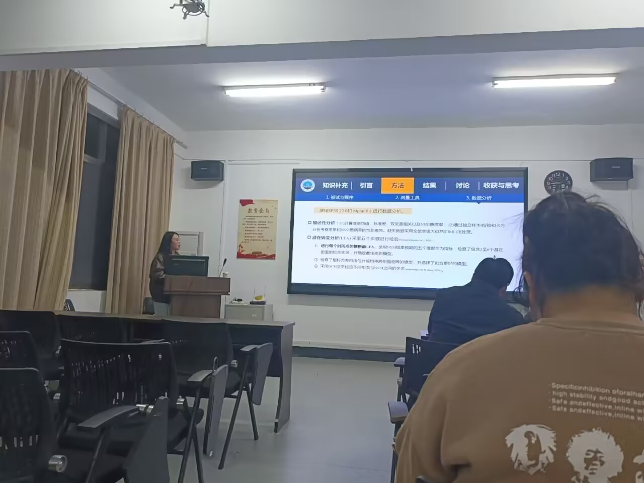 紧接着,秦珂楠同学汇报了Journal of Youth and Adolescence上发表的Patterns and Transitions of Nonsuicidal Self-njury Outcome Expectancies and Their Associations with Nonsuicidal Self-Injury among Adolescents》。该文章虽然比较复杂,但是秦珂楠同学以清晰的逻辑思路带领我们学习了NSSI结果预期的模式和转变。秦珂楠同学从知识补充、引言、方法、结果、讨论、收获与思考六个方面进行汇报,对文章中出现的概念、使用的方法进行讲解,带领大家看文章中的图表和数据。共同学习了以个体为中心的统计方法(LCA和LPA)及其在纵向设计中的延伸和应用,即(RI-)LTA,并且加深了对于随机截距的理解。朱晓伟老师赞扬秦珂楠同学汇报的非常到位,希望大家都可以从每周汇报中学到新的东西。