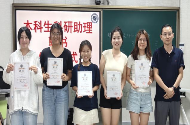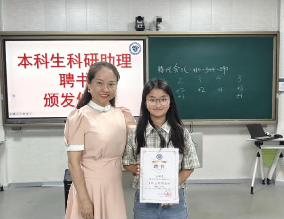 紧接着各位老师依次上台,为16名本科生科研助理颁发聘书,并由本科生科研助理代表上台发言,分享他们的科研经验和感受。