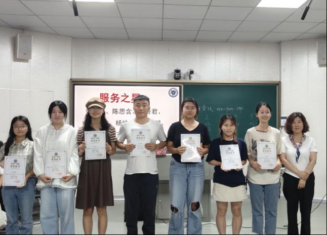 然后,获得2023-2024学年长大社心年度“服务之星”荣誉称号的学生是:应心12202班姚露馨、应心12201班高馨燚、应心12202班陈思含、应心12202班王悦慧、应心12101班肖香君、教育12101班杨绅毅、学前12101班令狐余佳,由郑雪艳老师为以上获奖者进行颁奖。