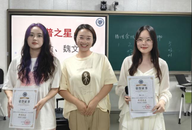 首先,获得2023-2024学年长大社心年度“编辑之星”荣誉称号的学生是:应心12202班郎浩源、教育12102班叶倩、英师12202班李子晗;获得2023-2024学年长大社心年度“科普之星”荣誉称号的学生是:心健QZ221班魏文欣、心健QZ231班李璐瑜,由甘进华老师为以上获奖者进行颁奖。