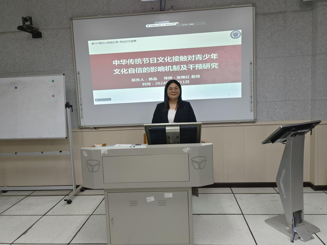 其次是韩淼同学,汇报内容为:《中华传统节日文化接触对青少年文化自信的影响机制及干预研究》。一共分为四项研究:研究一采用问卷法,验证并修订中华传统节日文化接触量表;研究二采用问卷法,探究中华传统节日文化接触与青少年文化自信的关系;研究三采用追踪法,探究中华传统节日文化接触对青少年文化自信的影响;研究四采用干预法,通过团辅干预探究中华传统节日文化接触对青少年文化自信的影响并提出相应教育对策。