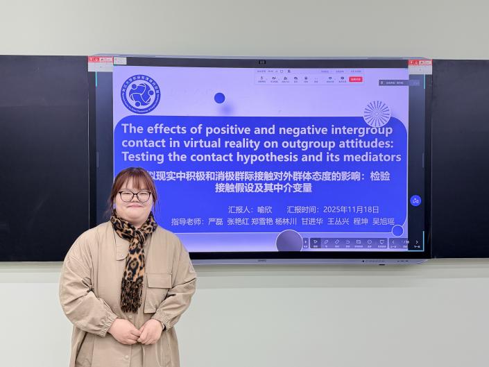 首先,喻欣同学进行了文献汇报,其汇报题目为《虚拟现实中积极与消极群际接触对外群体态度的影响:检验接触假设及其中介变量》。