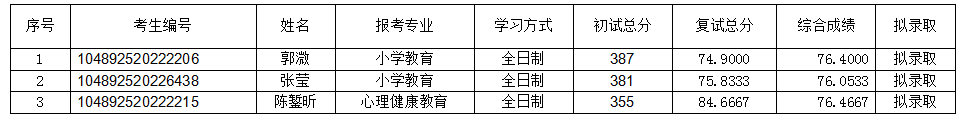 根据学校相关政策及《教育与体育学院2022年硕士研究生招生第一批复试成绩及结果公示》通知精神,按照新增硕士招生计划从已通过复试的考生(备选拟录取)中依次拟录取的原则,现对新增3名拟录取全日制专硕考生复试成绩及结果予以公示。