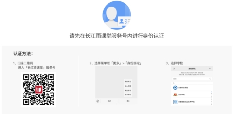 身份认证(如果已完成身份认证,请略过此步骤):登录平台前,请先在“长江雨课堂”微信服务号内进行身份认证-选择学校:长江大学,按页面提示输入账号密码(账号是学号,密码是学号后6位)