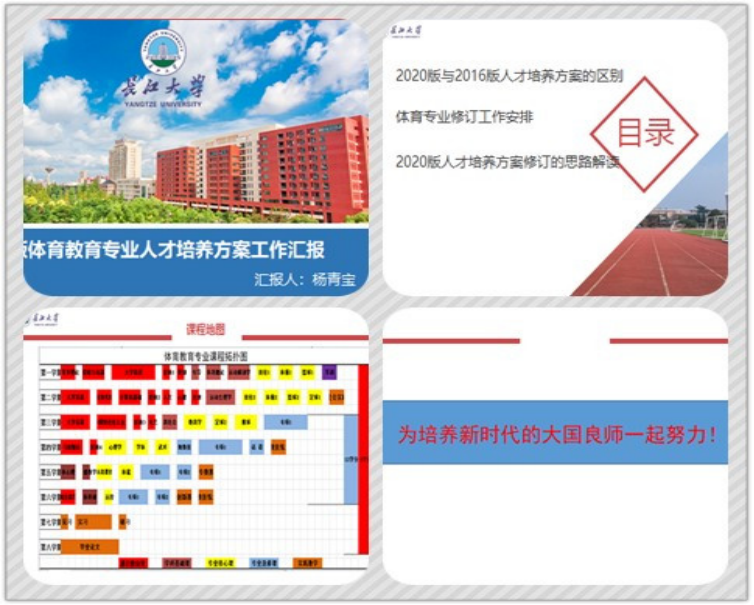 会议首先由体教系主任杨青宝副教授对2020版体育教育专业人才培养方案(讨论稿)进行了工作汇报,重点对2020版人才培养方案各部分内容修订思路进行了解读。