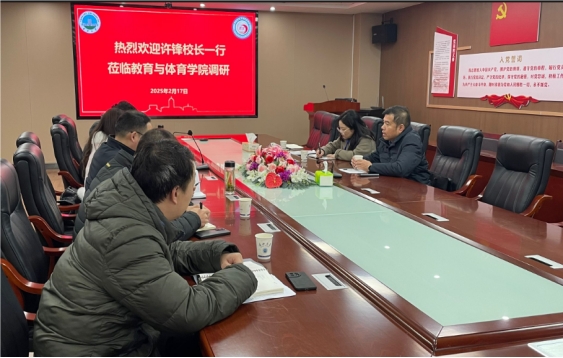 2025 年 2 月 17 日,教体学院开学第一天,分管校领导许锋副校长莅临我院开展调研工作,为新学期各项工作的顺利开展把脉定向。学院各分管领导在院长张艳红和书记于永伟的带领下就教学、科研、学工、教师教育等方面工作进行了详细汇报,许锋副校长就相关问题提出宝贵建议与改进措施,为学院发展注入强劲动力。