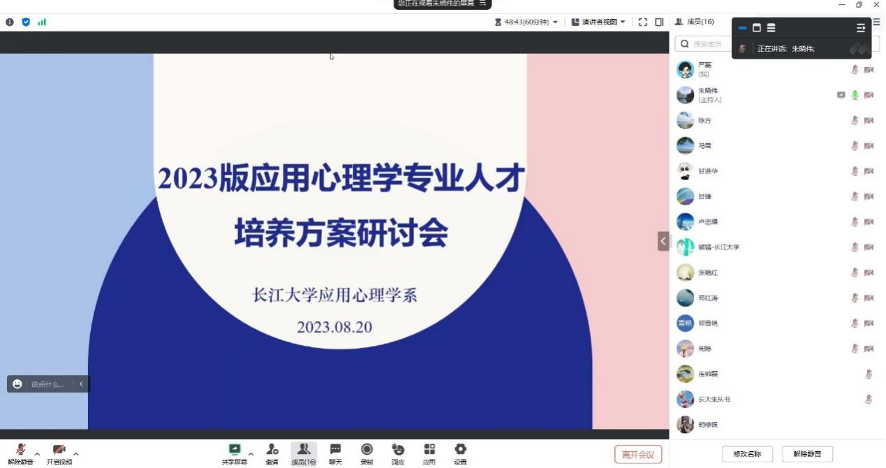 为落实学校关于修订2023版本科专业人才培养方案的工作安排,全面提升应用心理学专业人才培养质量,8月20日晚,教育与体育学院应用心理学系线上召开2023版应用心理学人才培养方案修订工作研讨会议。学院院长张艳红、副院长熊猛及应用心理学系16位老师参加了本次会议。