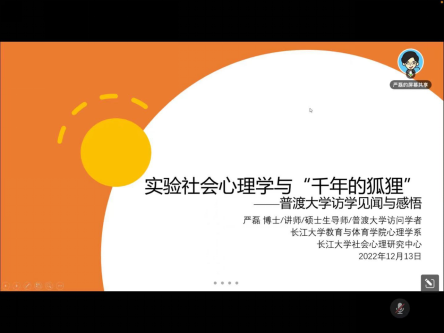 (通讯员 姚慧爽)12月13日晚上7点,长江大学教育与体育学院第四届研究生学术科技节校内导师讲坛第二讲线上开讲。本次特别邀请严磊博士主讲,讲坛由熊猛副院长主持, 我院100余名师生参与。