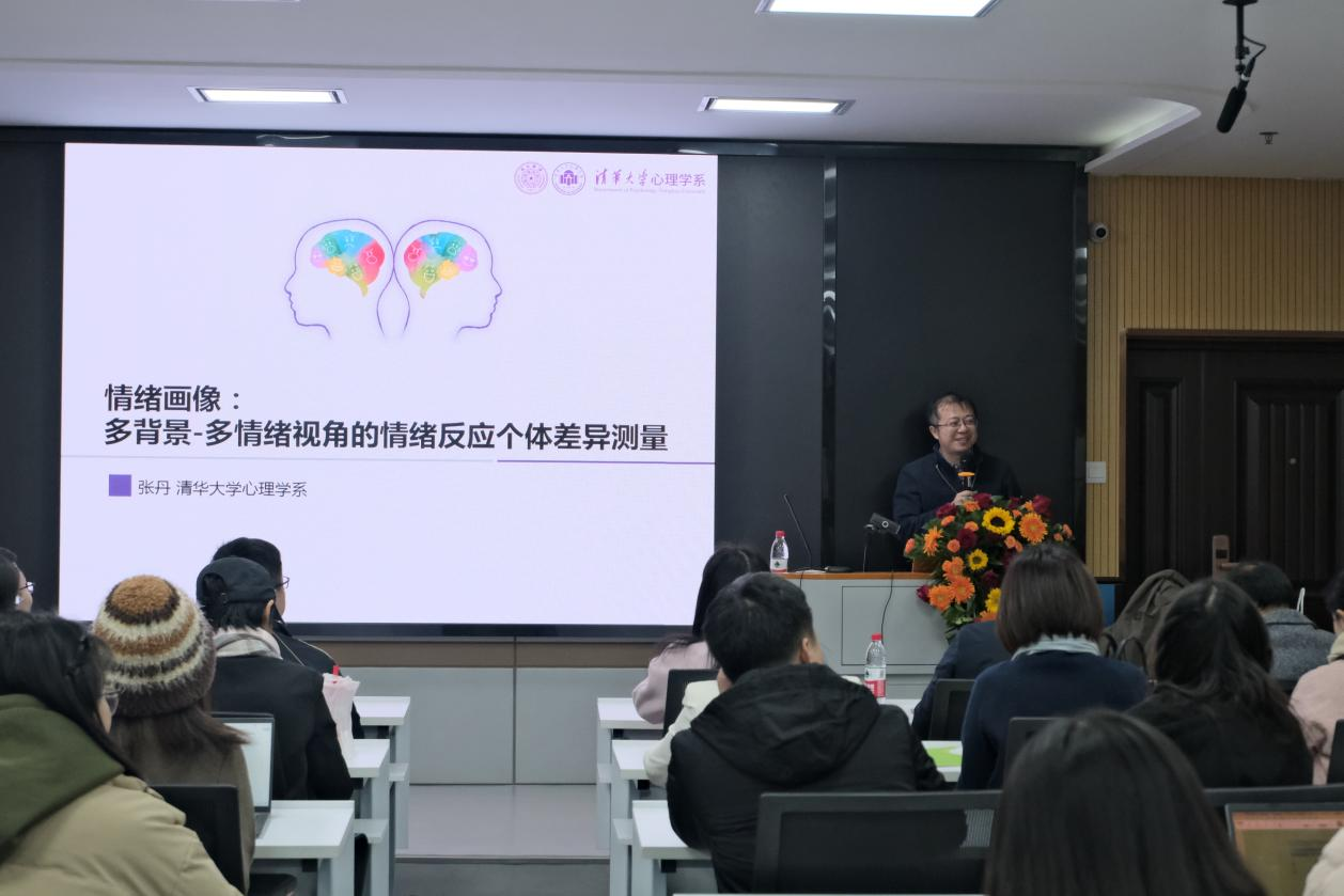 张丹教授介绍了一项其团队最近在神经科学国际权威期刊NeuroImage上发表的研究成果。报告首先提出了一种以多背景和多情绪视角构成的高维空间中的个体间距离作为情绪画像个体差异的测量方案,并通过两项行为实验验证了这一测量方案的信效度。接着,张丹教授从心理机制和神经表征两方面通过一项行为实验与一项脑电实验对情绪画像个体差异的心理机制做出了解释。最后以对抑郁症人群和正常人群的对比研究为例,呈现了其团队对情绪画像在现实应用上的探索。