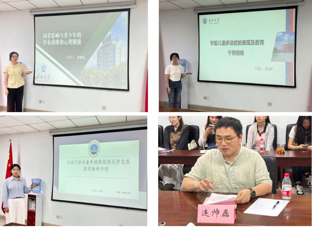 随后,教育与体育学院的三位同学也进行了分享。徐媛钰同学则以《同辈影响与青少年的学业成绩和心理健康》为题,分析了提高班级内学生能力的多样性,不仅有利于每一位同学能力的提升,而且不会给心理健康造成负面的影响。赵玉娇同学以《学前儿童多动症的表现及教育干预措施》为题,从心理干预治疗、医教和家庭系统疗法、康复治疗等方面展开分析,教育干预有利于学前儿童多动症的治疗与愈后。张泽同学以《闪动疗法对童年创伤经历大学生焦虑情绪的干预》为题,展示了闪动疗法对童年创伤经历大学生的焦虑情绪改善有重要意义。各位嘉宾老师们对五位主讲人的汇报分别进行了详尽的点评,并给予了实质性的建议。