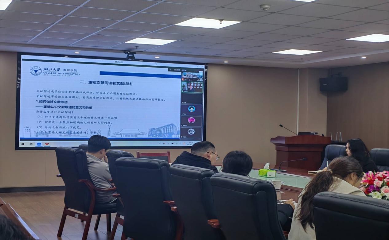 为了强化我院研究生导师培养,提升导师岗位胜任力,全面提高研究生培养质量,尤其是学位论文质量。2024年12月4日晚,我院在文科大楼905会议室举行本学期第二场导师培训,本次特邀浙江大学张应强教授进行线上讲座,讲座主题为《教育学硕士学位论文的选题和写作》,我院教育学专业全体研究生导师参会,培训会由熊猛副院长主持。