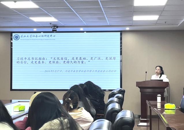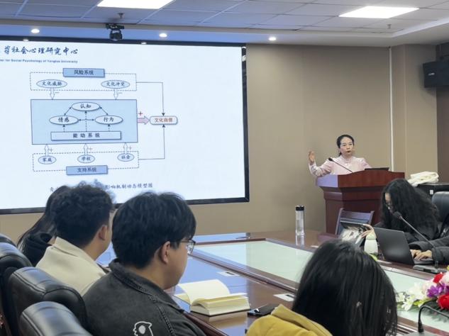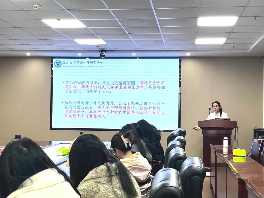 张艳红教授向同学们介绍了"青少年文化自信三系统影响机制动态模型",阐明了风险系统和支持系统对青少年文化自信的动态影响,并且强调了学校这一支持系统在促进青少年形成文化自信方面的重要作用。同时,张教授也向同学们介绍了其团队现有的研究成果,如:文化自信对 AI 感知心智能力的影响、文化自信对亲社会行为的影响、中华传统节日文化接触对文化自信的影响等。
