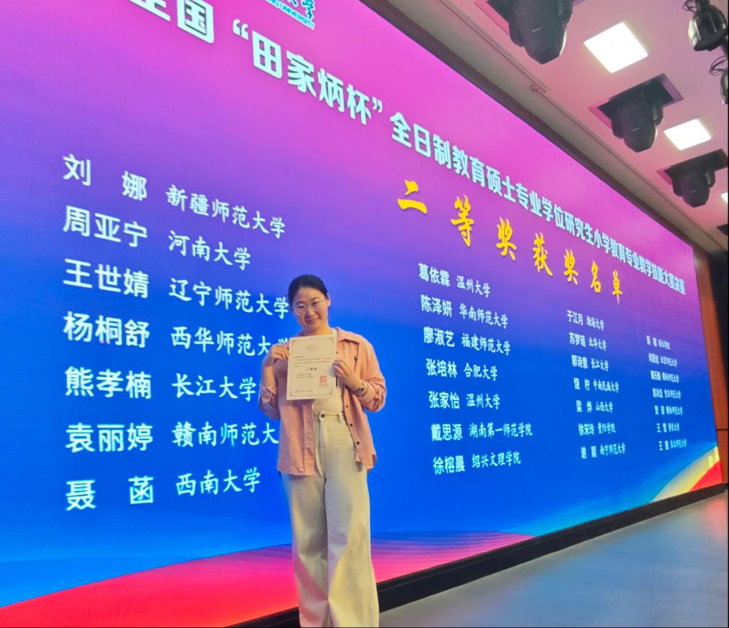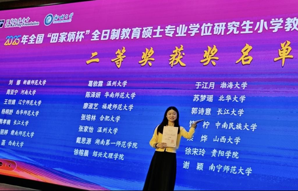 (通讯员 郭诗意)10月24日至26日,2025年全国“田家炳杯”全日制教育硕士专业学位研究生小学教育领域教学技能大赛决赛在聊城大学举办,同期举行了小学教育专业学位硕士研究生高质量培养研讨会。我院小学教育研究生郭诗意、熊孝楠凭借扎实的教学功底与创新的教学设计脱颖而出,双双斩获二等奖,实现了学校在该赛事小学教育领域的历史性突破。