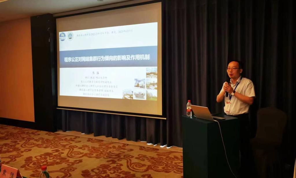 在大会报告环节,张艳红教授受邀在主会场作了“孤独感与手机成瘾”的大会重点报告并主持了社会与人格心理论坛分会场报告;熊猛教授受邀主持了网络心理与行为论坛分会场并作了“程序公正对网络集群行为倾向的影响及作用机制”的主题报告;朱晓伟副教授受邀参与了心理学人才培养论坛分会场研讨交流。心理学研究生程丽媛、魏文欣、任杰和体育学研究生杨玉娟分别围绕“网络小说成瘾与抑郁”、“权力感与大学生亲社会行为”、“童年压力与锻炼承诺”、“拖延行为的现状、热点与前沿”等主题在分会场作了学术报告。闭幕式上还举行了学术年会优秀论文颁奖仪式,熊猛教授提交的研究成果《程序公正对网络集群行为倾向的影响及作用机制》荣获优秀论文一等奖。