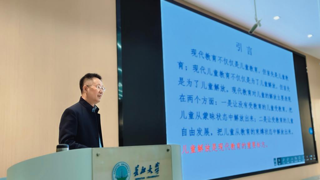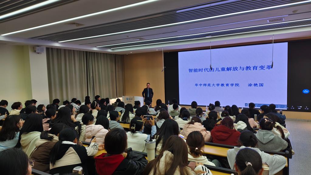(通讯员 刘琦)2025年11月20日14:00,16教A109智慧教室座无虚席,一场以“智能时代教育新生态”为主题的精彩讲座如期举行。华中师范大学教育学院涂艳国教授担任主讲人,其中“儿童解放与教育变革”是本次讲座的核心议题。报告会由教育与体育学院院长张艳红主持,教育学专业本科生、研究生及教育系全体教师共计160余人聆听报告。