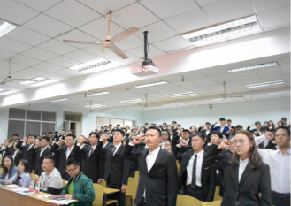 大会伊始,由各部门部长上台介绍其部门职能及新成员,新成员依次答到,台下掌声滚滚,气氛一片热烈。随后,主席团各个成员依次进行自我介绍,并为同学送上寄语,真切地表达了对新成员们的期望,勉励新成员们搞好学习,认真工作,做同学榜样。接着,分别由班主任代表潘友刚老师和团委书记文晓武老师发表讲话。潘友刚老师为同学们今后的大学生活提出“进行凝聚力、战斗力、团队力、沟通力和关爱力的五力培养”等宝贵建议,情真意切,体现出老师一片良苦用心。文晓武老师结合了自己的亲身经历,告诫大家要端正思想,同时向同学们介绍了学生会的准则与制度,让同学们对自己的职务有了更深层次的理解,为学生干部日后的工作奠定基础。 然后,全体成员在团委副书记白旭青的带领下,进行了郑重的宣誓仪式。每个人都满怀激情,表情严肃,铿锵有力地念出宣誓词,将大会氛围推向了高潮。最后,大家进行了集体合影。本次大会在热烈的氛围中圆满结束。