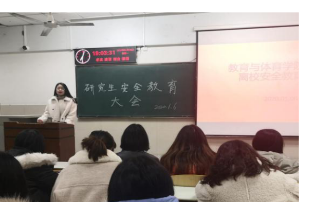 (通讯员 苏春来)为了学生安全着想,1月6日晚7时许,我院在12教104教室举办了研究生“寒假安全教育大会”。此次与会的人员有辅导员任雯婷以及全体研究生,主讲人为邵倩。