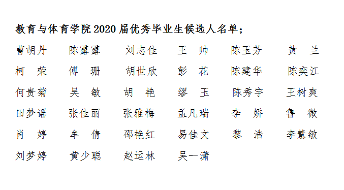 根据中共长江大学委员会学生工作部《关于开展2020届优秀毕业生评选与表彰工作的通知》精神,经学生本人申报、班级提名、学院审核,评选出陈露露等34名同学为教育与体育学院“长江大学2020届优秀毕业生”候选人,现对上述人选予以公示。
