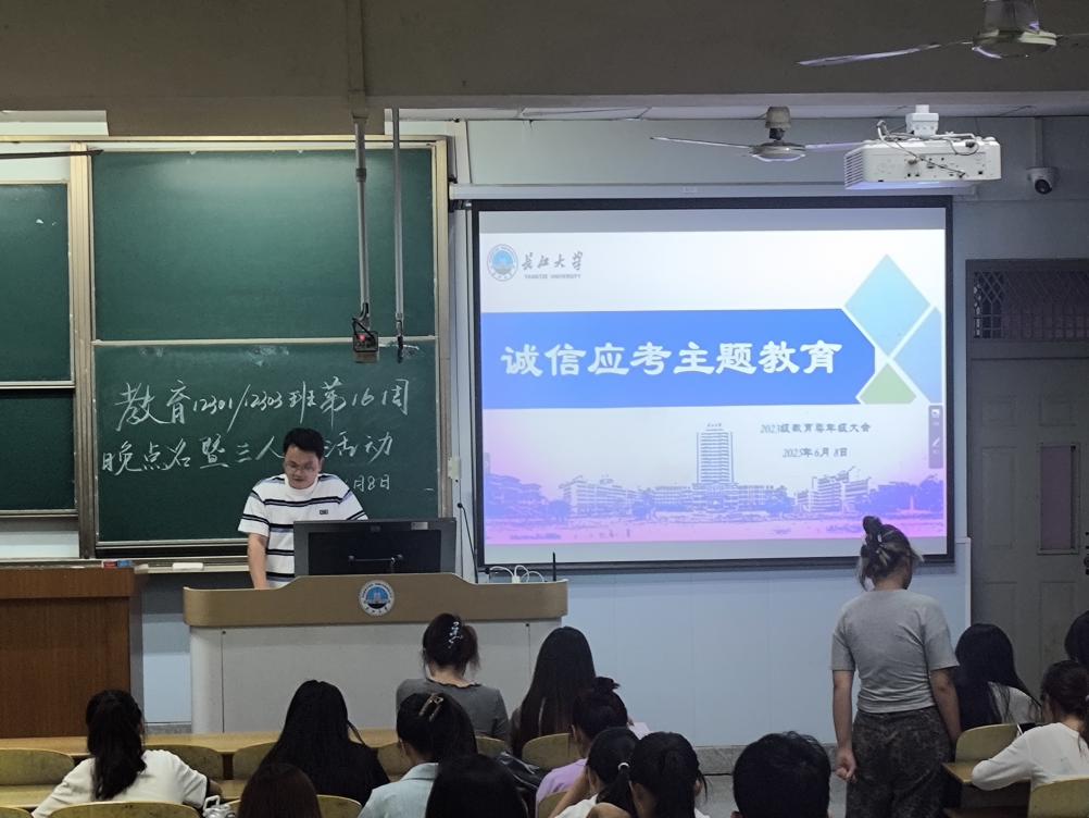 (通讯员:孙家伟)随着四六级考试和期末考试不断临近,为了让同学们认识到考风考纪的重要性,树立正确的考试观念,培养良好的学习习惯和道德品质,促进学生的健康成长,教育与体育学院积极响应学校号召并组织各班级于6月3日——6月10日期间召开了“诚信应考”主题教育班会。会议由各班班主任和班长主持,全体同学参加。