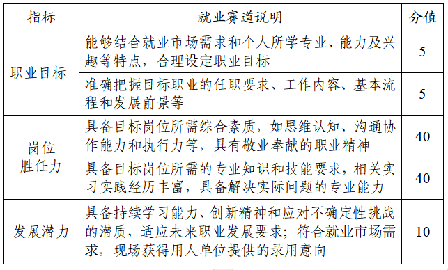 (二)就业赛道。参赛对象为普通本科三、四年级学生及全体研究生,考察其求职实战能力,个人发展路径与经济社会发展需要的适应度,就业能力与职业目标和岗位要求的契合度。