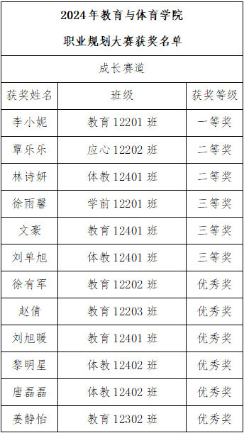 根据《关于举办2024年教育与体育学院职业规划大赛的通知》要求,经过评委打分,结果如下: 优秀组织奖:瞿廷婷 程佳琪 如有师生对本次评审结果持有异议,请于公示期间通过电话或电子邮件等方式反映。 公示时间:2024年11月20日至2024年11月22日 联系电话:0716-8062970 联系邮箱:2173300237@qq.com 教育与体育学院学生事务办公室 2024年11月20日