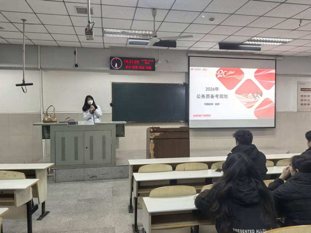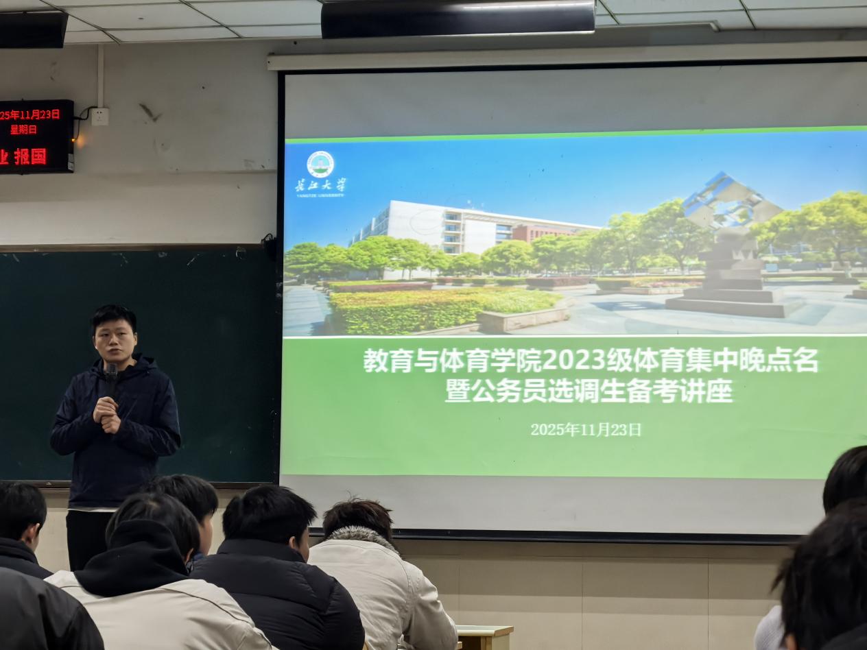 (通讯员 刘濠淙)为扎实推进年级管理工作,助力体育专业学子明确就业方向、科学备战公务员考试,2025年11月23日,长江大学教育与体育学院2023级体育集中晚点名暨公务员选调生备考讲座在12教102教室顺利举行。本次活动兼顾日常管理与就业指导,为同学们搭建了精准化的成长服务平台。