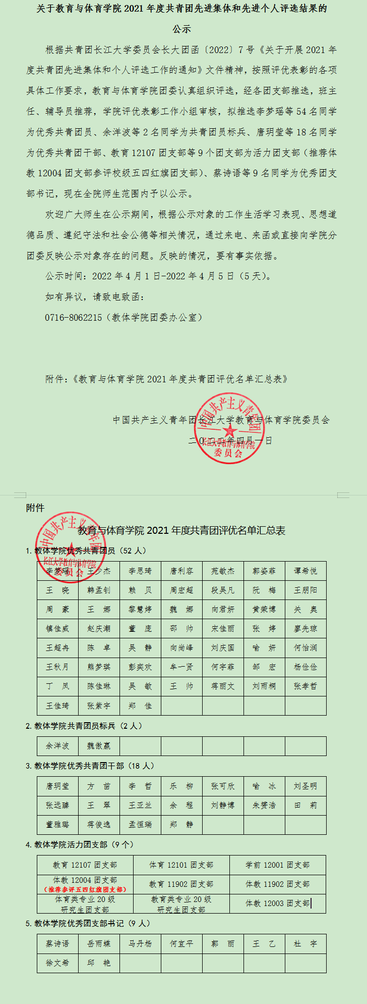 关于教育与体育学院2021年度共青团先进集体和先进个人评选结果的公示