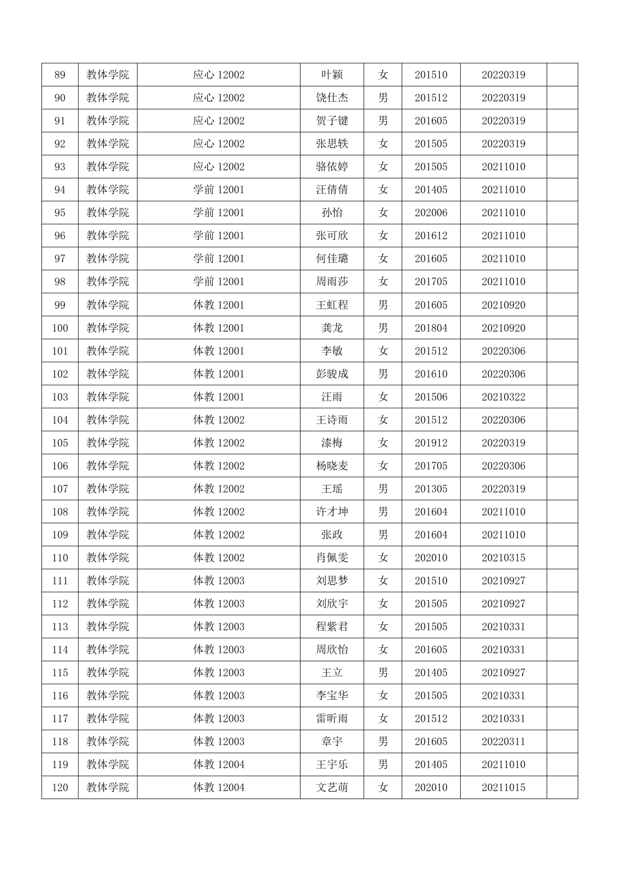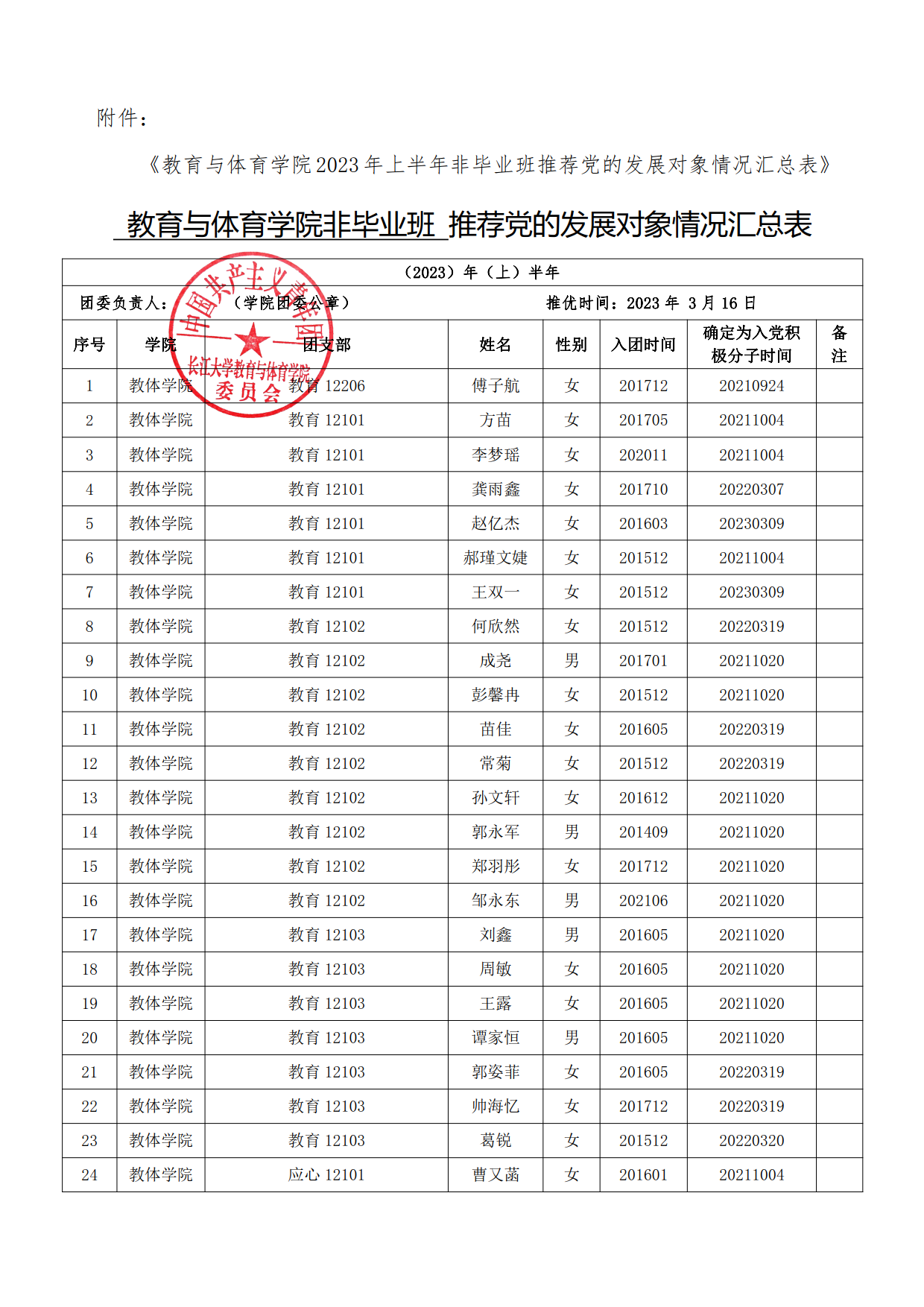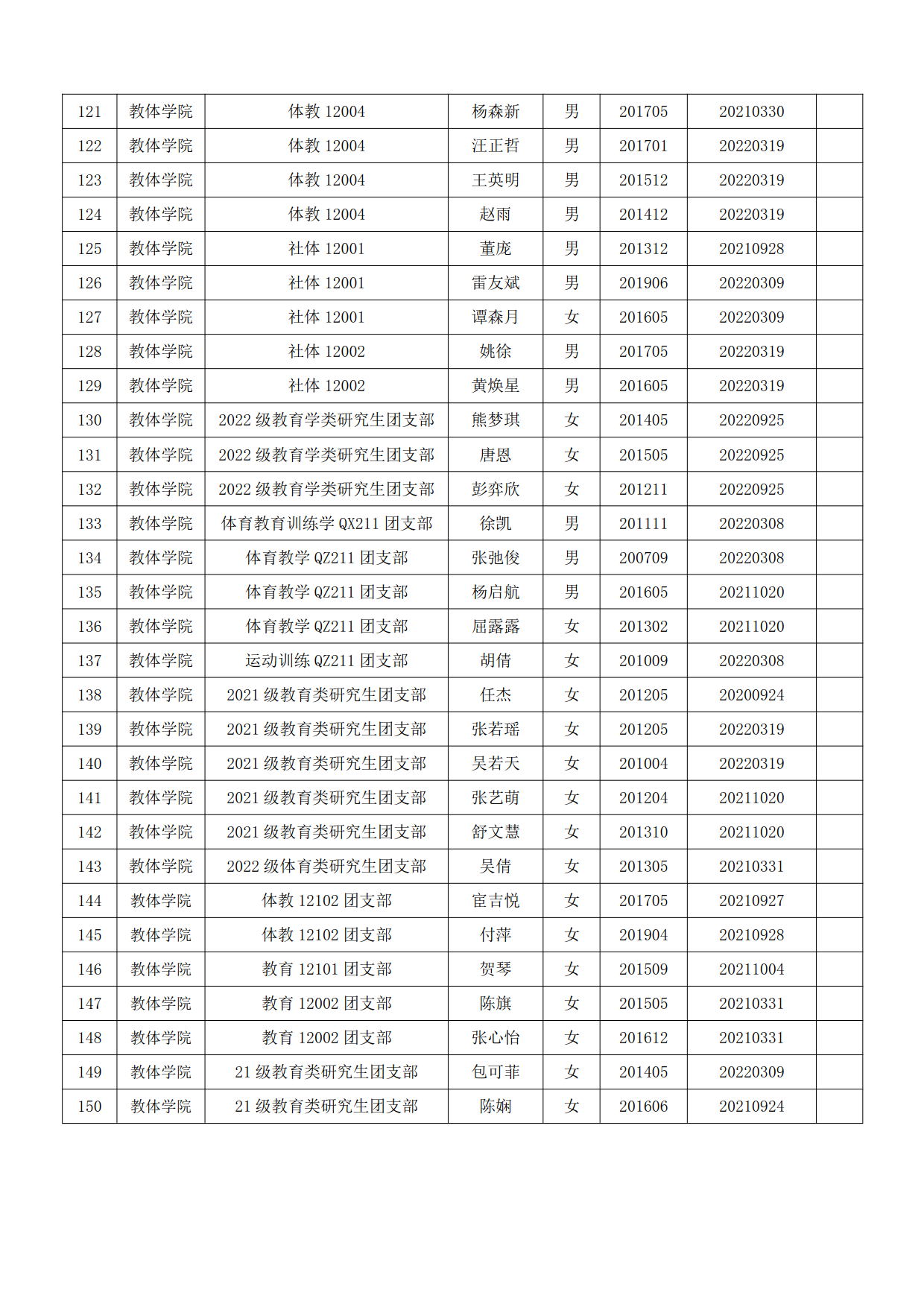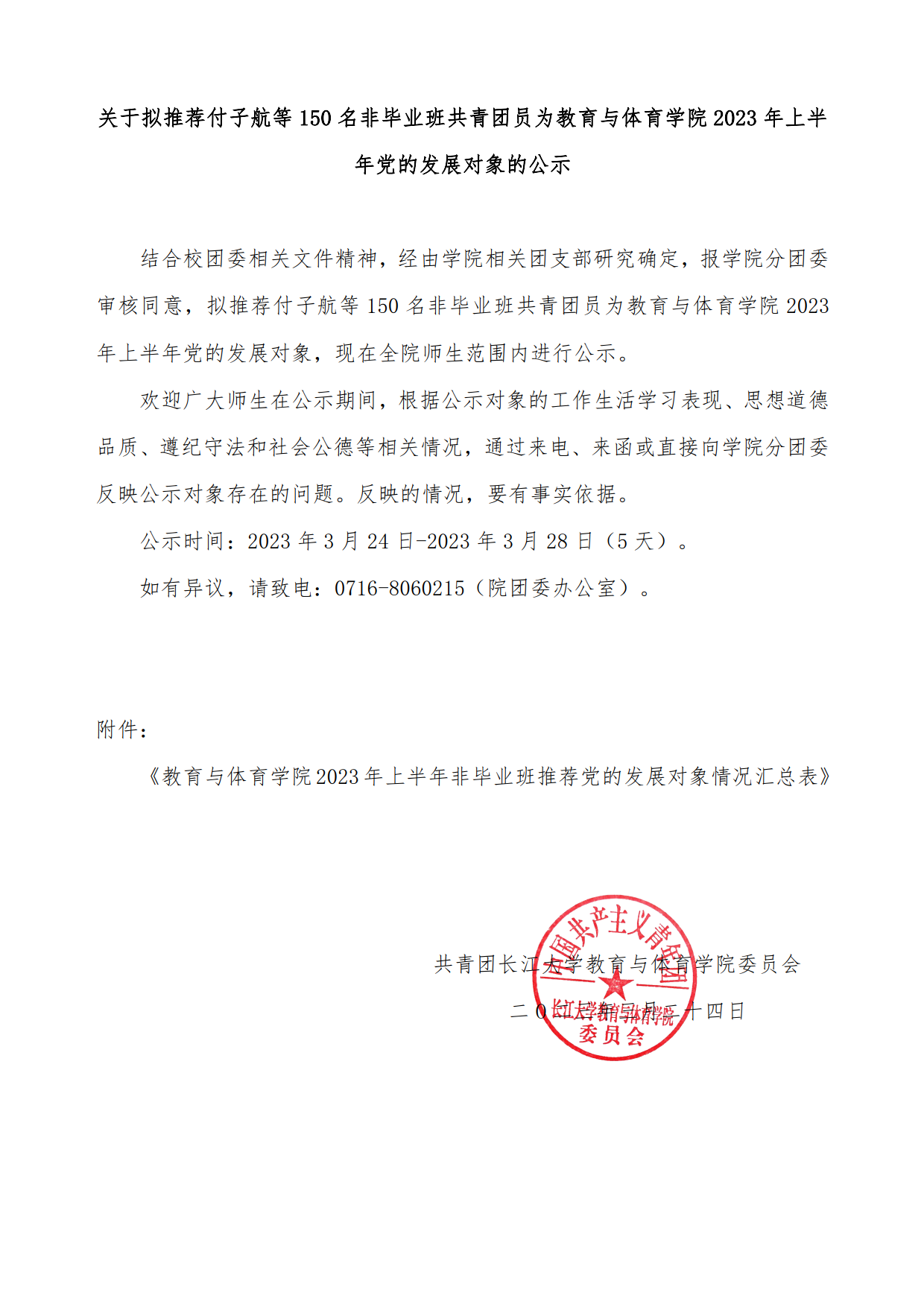 关于拟推荐付子航等150名非毕业班共青团员为教育与体育学院2023年上半年党的发展对象的公示