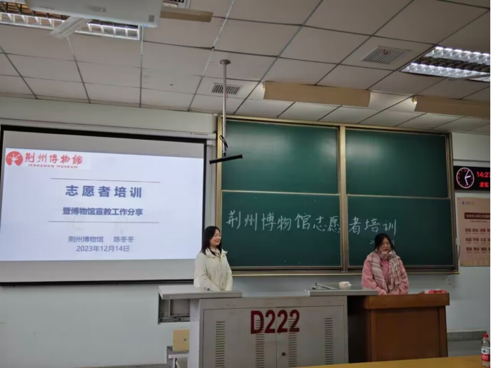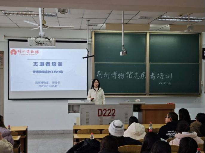 【通讯员 胡诗慧 刘雨薇 王传琦】冬藏万物,不御铅华亦不忘初心。为帮助志愿者们更好地了解博物馆讲解员的价值意义以及讲解员的具体要求,12月14日下午2时,教育与体育学院于东校区13教D222举办荆州博物馆讲解员志愿者培训活动。本次活动邀请了荆州博物馆宣教部主任陈冬冬老师作为主讲人,辅导员喻泽坤、任雯婷老师以及全体博物馆志愿者参会。活动由王然主持。
