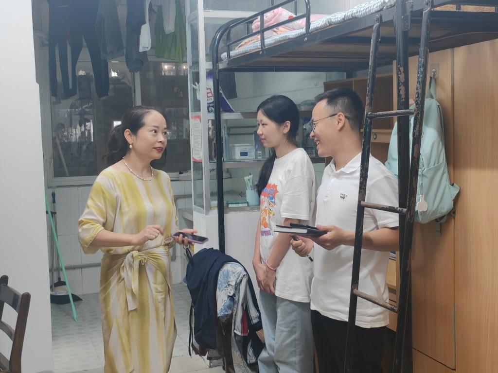 在院领导的引领下,辅导员及班助对新生宿舍进行了例行巡查,了解并关心新生的生活状况。在交流过程中,张艳红院长亲切地与同学们打招呼,新生们略显紧张的同时又充满感动,与老师分享自己的兴奋与憧憬。期间,于永伟书记和何可可副书记认真检查了寝室设施是否完善,强调要确保同学们有一个安全、舒适的居住环境。新生辅导员贺康锋则耐心地提醒同学们军训的相关事宜。