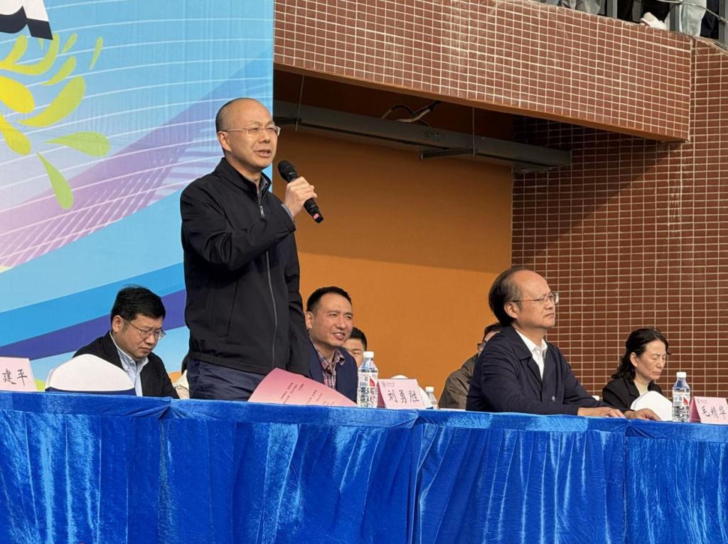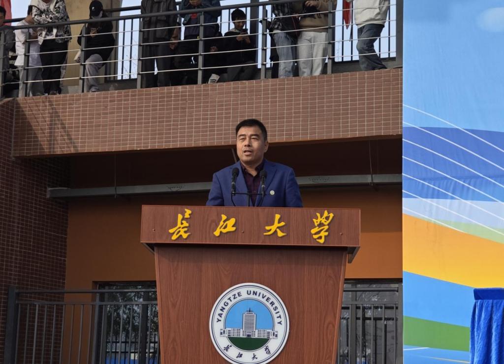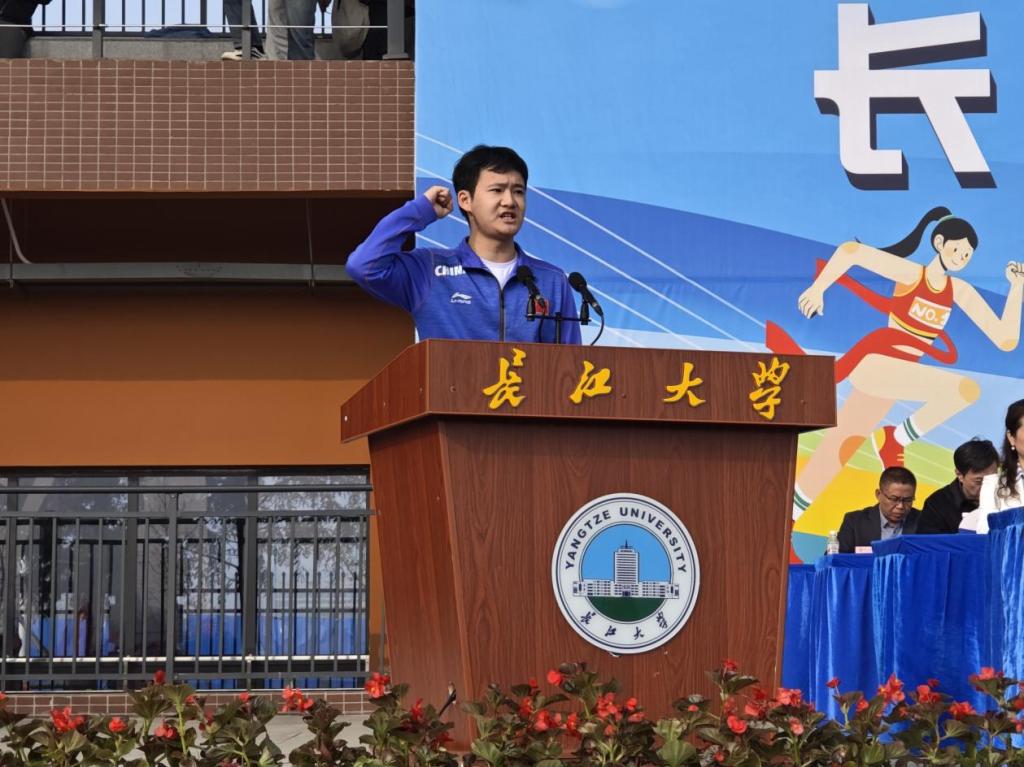 在国歌声中,全体肃立,五星红旗缓缓升起。随后,副校长许锋致辞。他回顾我校运动健儿们在各项赛事中取得的辉煌成绩,鼓励运动员们赛出青春活力,赛出长大风采,将求实、进取、创业、报国的长大精神融入体育运动中。许校长表示,长江大学一直坚持贯彻健康第一的教育理念,在今年,对体育馆及运动设备进行维护改造和升级,推动全校迎来环境一流的运动环境,鼓励同学们在运动中增强体质、磨砺意志、锤炼品格,最后,他希望全体运动员以饱满的激情和昂扬的斗志赛出成绩,赛出风格,全体工作人员秉承公平公正原则,维护运动会的稳定进行。