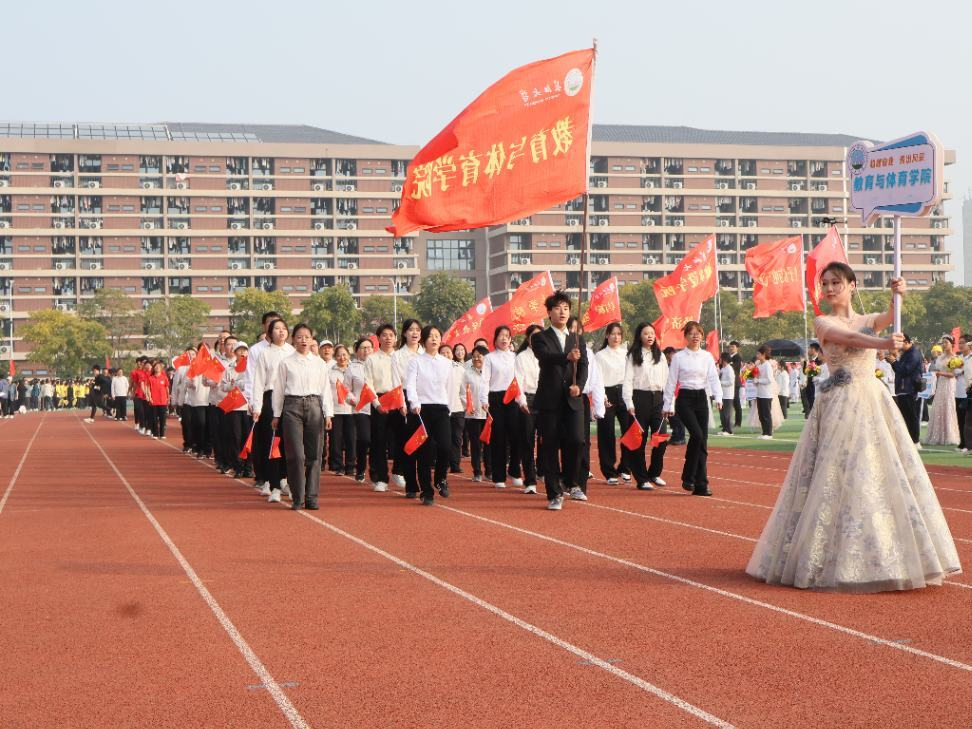 随着激昂的进行曲响起,国旗护卫队、彩旗方阵与鲜花方阵依次入场,他们朝气蓬勃,英姿飒爽,尽显青春力量。紧跟其后的是各学院方阵,表演精彩纷呈,每一个方阵都独具特色,充分展示了新时代青年的蓬勃朝气和积极向上的精神风貌。教育与体育学院方阵迈着坚定的步伐入场,他们身着统一的服装,姿势规范,口号洪亮,手持彩烟,以奔跑之姿展现出教体学院勇往直前的磅礴气势。