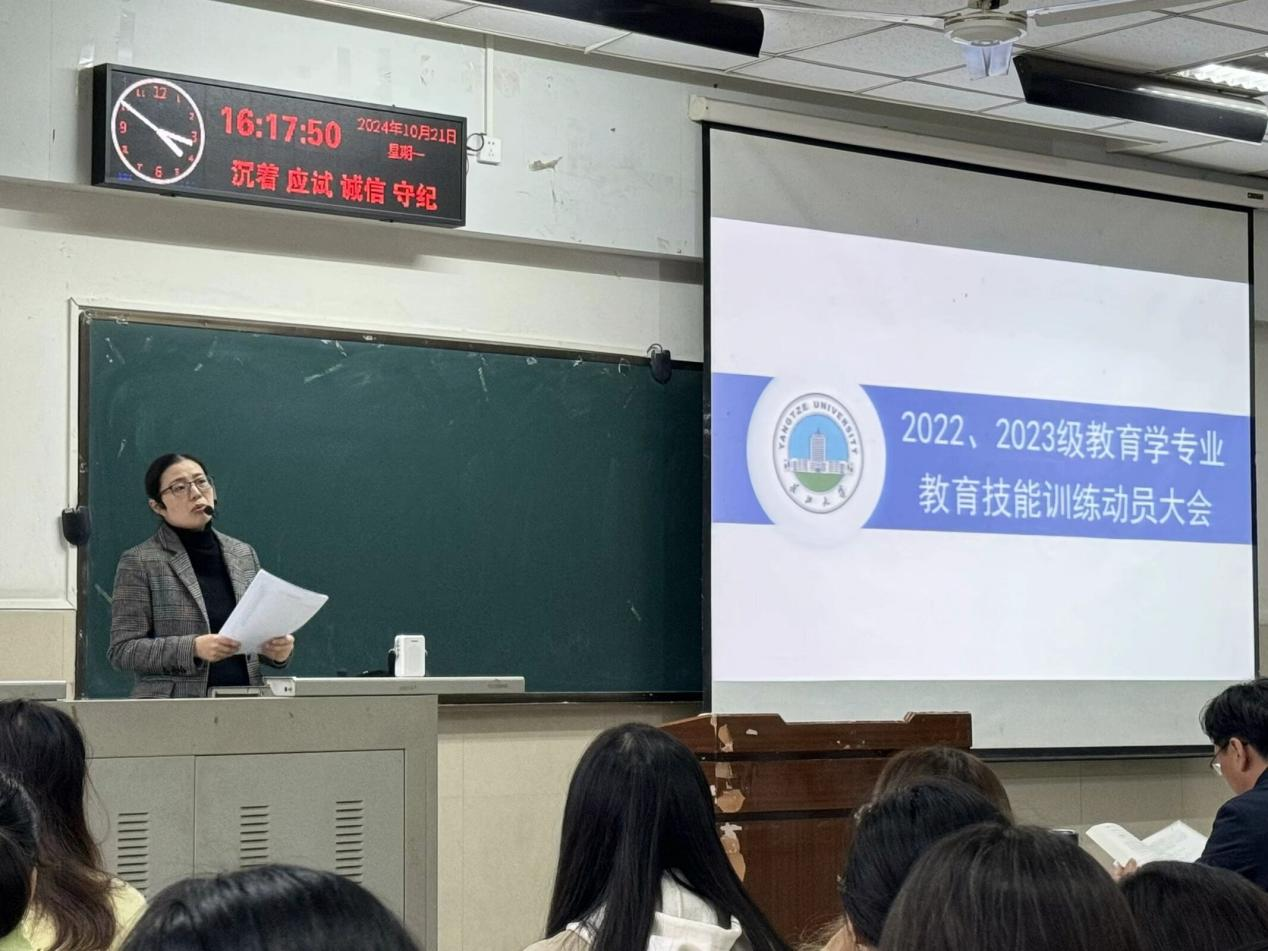 【通讯员 谷世家/文 黄方毅/摄】为夯实学生教学基础,提升教学质量。教育与体育学院于10月21日下午16时许,在12教102举行了2022级、2023级教育学专业教育技能训练动员大会。本次会议由周婷老师主持,教育与体育学院副院长杨青宝,王文静、唐青才、李红霞老师及全体2022和2023级教育类的学生参加。