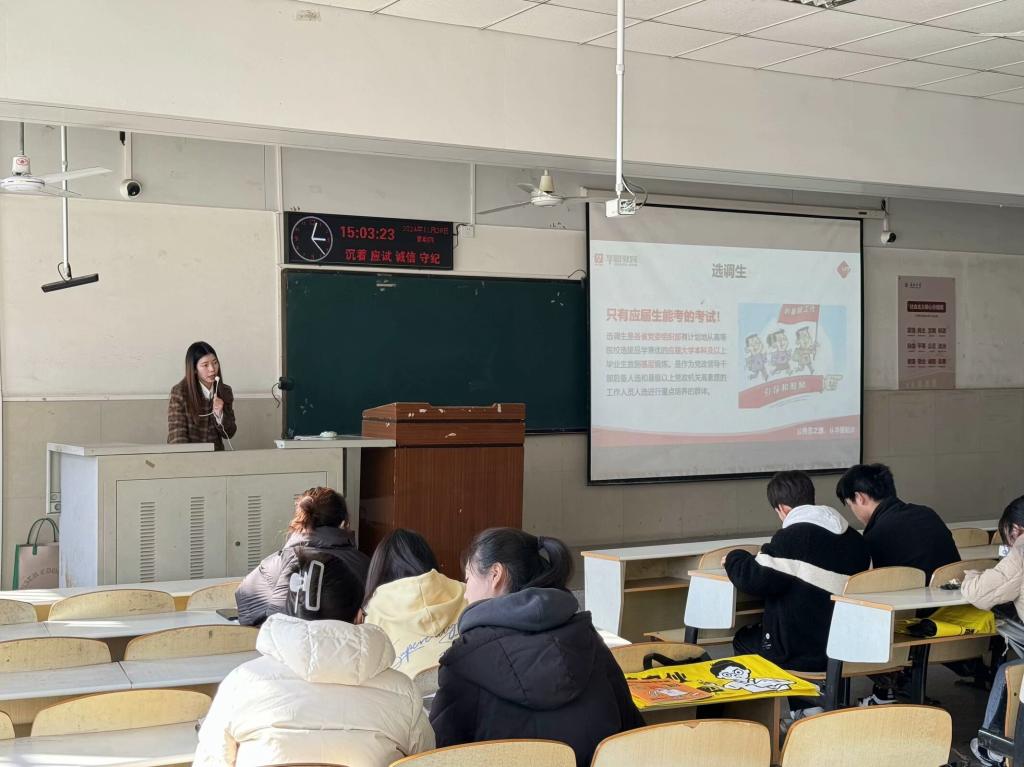 【通讯员 袁宝宏 杨雅月】考编择途,公途耀未来。为帮助学生明晰考公考编形势,提升备考能力与就业竞争力,教育与体育学院于 11月28日14时许在12教104举办了考公考编备考和就业指导讲座,特邀资深专家占欢老师担任主讲嘉宾,此次讲座吸引了众多有志于投身公职领域的学生参与。