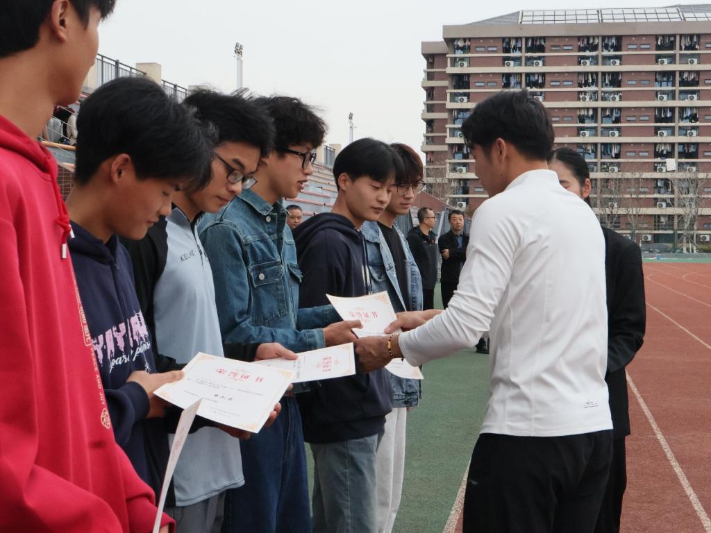 【通讯员 叶怡蘩】一年一度春草绿,强身健体正当时。为全面推进素质教育,提升学生的身体素质,渲染校园足球文化氛围、传承足球魅力,2025年3月22日,长江大学第二十二届运动会专业组足球赛圆满落幕,颁奖仪式顺利举行。长江大学教育与体育学院党委副书记何可可、副院长杨青宝、体育教育系副主任薛凌、社会体育指导与管理系系主任孔祥魁、专业组足球赛裁判长胡国江、班主任代表倪锡锋以及学生代表参加本次活动。