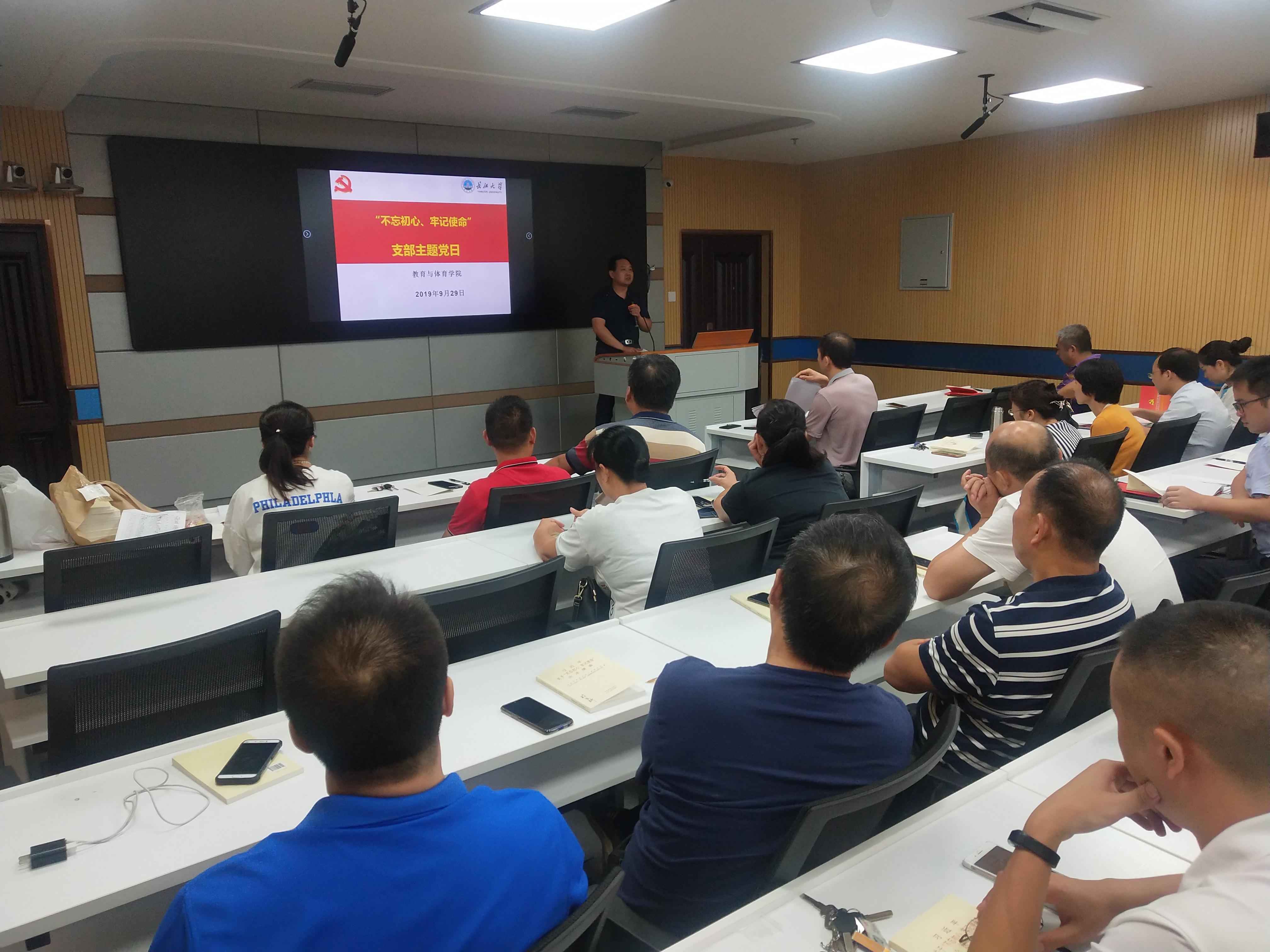 9月29日晚7:00,教育与体育学院组织全体党员在文科楼910会议室开展了“不忘初心、牢记使命”主题教育部署工作及主题党日活动。分党委副书记李则俊主持了本次会议。