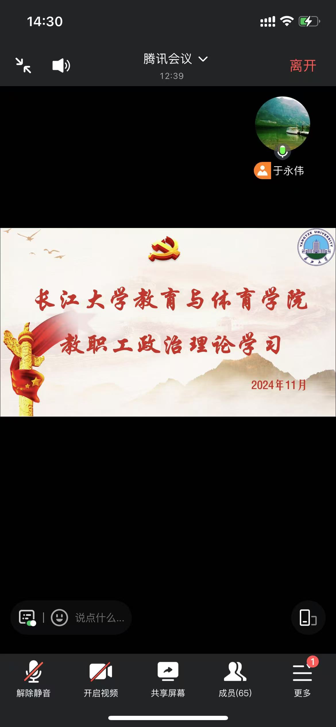 【通讯员 邓怡乐】2024年11月28日下午,我院开展了十一月份教职工政治理论学习及意识形态专题工作会议。此次会议采取线上形式,由我院党委书记于永伟主持,院领导班子及全体教职工参与。