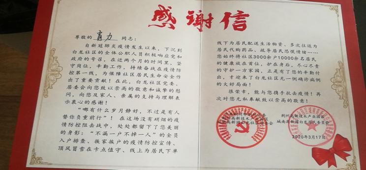 在这场没有硝烟的疫情防控阻击战中,肖力同志“不漏一户不掉一人”的全员入户排查、挨家挨户的疫情防控宣传、顶风冒雪卡点值守、线上为居民下单线下为居民配送生活物资、多次往返为居民代购药品、疏导居民恐慌情绪……始终将社区10000余名居民的健康放在首位,护在身后,尽心尽责守护一方家园,值得一提的是,白龙社区迄今为止无一例确诊病例。