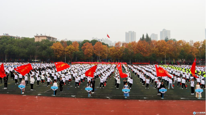 健康排舞《没有共产党就没有新中国》拉开了文体表演的序幕,来自各学院的912名学生以跃动的身姿,整齐划一的舞步,表达对党的心声。激昂的乐曲伴随着绚丽的伞花,演员们用伞面摆出锤子镰刀、“1921-2021”“中国”“长大我爱你”等各种图案,唱响新时代的《盛世欢歌》。教育与体育学院的表演《旗舞飞扬》尽显长大学子凌云之志。