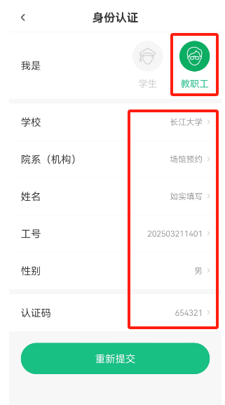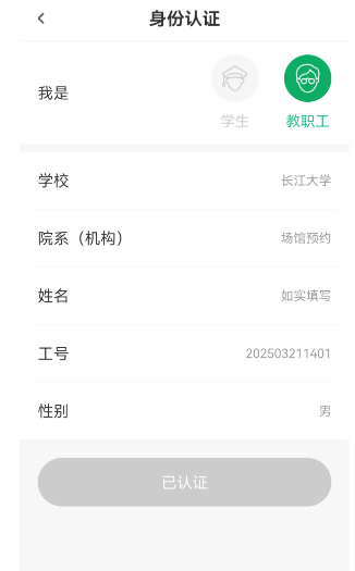 首先请在“华为应用市场”或“App Store”等应用下载平台搜索 下载 “步道乐跑” App. 完成下载后进行以下操作: 身份认证操作说明 【提交身份认证】 在“我的”页面,点击“立即认证”即可进入身份认证界面; 选择“教职工”并填写对应信息,学校选择:长江大学,院系选择:场馆预约,姓名:如实填写,工号:填年月日时间 2025年3月21日14:39 如填:20253211439,性别:男或女,认证码:654321,后点击“认证”按钮即可提交认证申请。