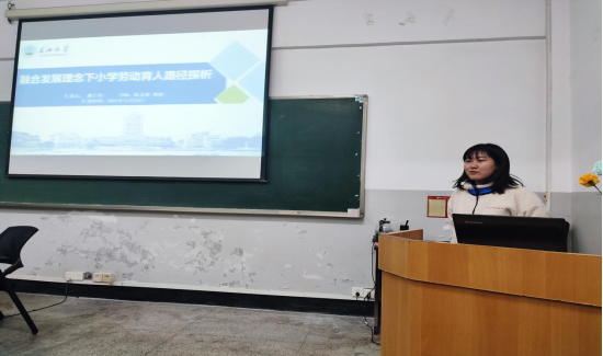 第三位汇报人是高聪。她的汇报主题是“具身化:义务教育阶段劳动教育实施路径”。她的汇报内容是基于具身理论的视角,揭示身体在劳动教育中的核心价值,探寻劳动教育与具身认知间的内在意蕴,分析离身困境的动因,探索劳动教育实施的路径。以期推动劳动教育回归身体的健康轨道,促进学生的全面发展和健全人格的实现。