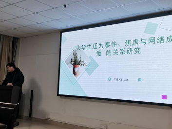 最后是张团同学,他就“大学生压力事件、焦虑与网络成瘾的关系研究”做了专题报告。张团同学主要从研究背景入手,分别分析了大学生压力的来源,焦虑的程度,和网络成瘾的关系,条理清楚、分析得当,让同学对大学生的压力与焦虑有了更深的理解。