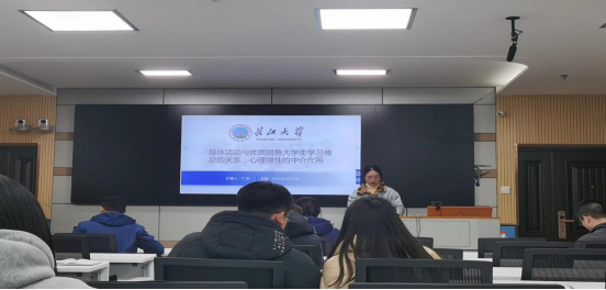 第五位是丁凤同学,她以“身体活动与体质弱势大学生学习倦怠的关系:心理弹性的中介关系”做了专题汇报。简单介绍了什么是学习倦怠,什么是心理弹性并提出假设:心理弹性可否作为中介变量对体育锻炼与学习倦怠间的关系起到部分/完全 中介作用?应用体育活动等级量表、大学生学习倦怠量表、心理弹性量表为研究工具进行了详细的学术汇报。