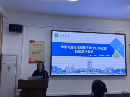 再者是小学教育学专业的柳苗同学,她就“小学专业标准视角下班主任专业化的困境与策略”做了专题报告。她以班主任的时代诉求和自身岗位要求为出发点,以建班育人立德树人为指导思想,从小学班主任专业化认知淡薄与班主任专业素养和专业职责意识不高两方面剖析专业标准下小学班主任专业化的困境,最后提出专业标准下小学班主任专业化发展策略的相关意见。