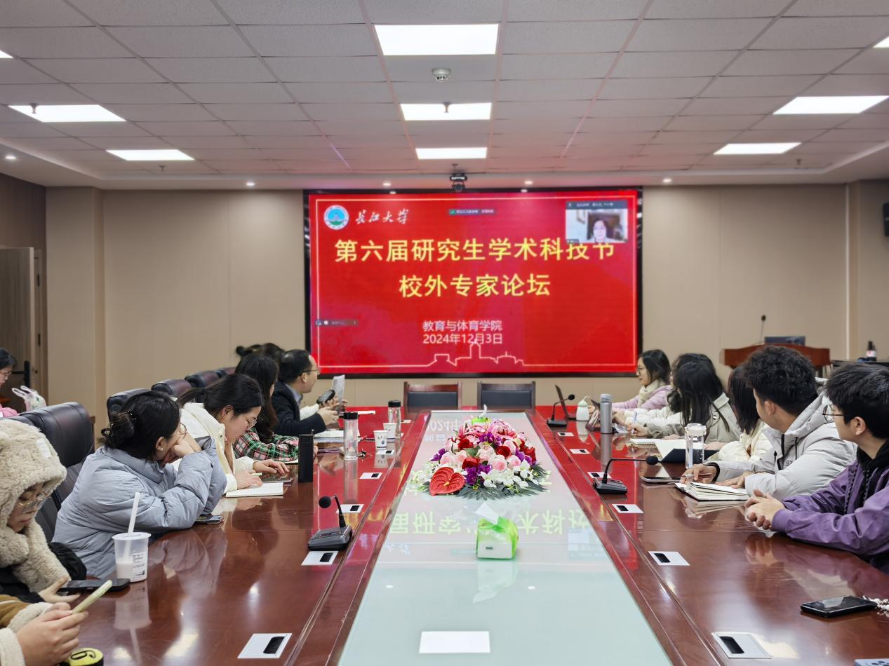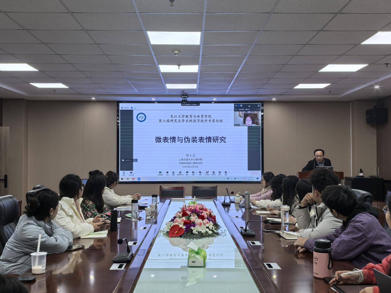 (通讯员 秦源)2024年12月3日晚,长江大学教育与体育学院第六届研究生学术科技节之校外专家论坛第一讲在文科大楼905会议室举行。本次特邀中国科学院心理研究所傅小兰研究员进行线上讲座,教育与体育学院院长张艳红教授、副院长熊猛教授以及2023级、2024级心理学专业研究生参会。讲座由熊猛副院长主持。