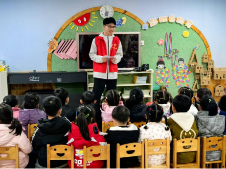 活动现场,青年志愿者支队队长陈欣颖与志愿者吴世阳通过情景化叙事方式,为幼儿讲述“雷锋雨中助人”等经典故事。通过生动讲述与直观教具展示,帮助幼儿建立对雷锋精神的初步认知,理解其核心内涵。