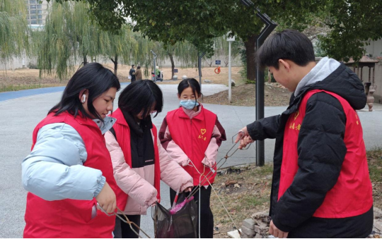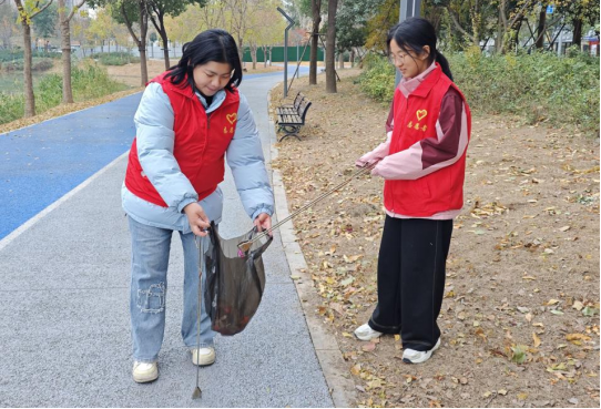 活动伊始,志愿者们团结协作、有序进行社区环境卫生打扫。身着红色志愿马甲的同学们手持垃圾夹、垃圾袋,沿着社区河畔步道、草坪及街巷角落细致清理杂物:弯腰捡拾草丛中的烟头和纸屑,协作分类收纳垃圾,不放过路面缝隙中的废弃包装。从河岸空地到居民楼下,志愿者们分工明确,默契配合,让冬日的社区环境逐渐恢复整洁,红马甲的身影成为街头一道温暖的风景线。
