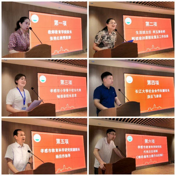 长江大学教师教育学院张艳红院长为本次培训班致辞,她表示通过本次培训希望能坚定大家的教育信念,真正做到勤学善思、力学笃行。随后,长江大学社会合作处洪云飞副处长热情的为大家介绍了长江大学概况和本次项目的筹备情况。生活班主任柯玉清老师为大家详细解读了培训课程设置及相关工作安排。孝感市教育科学研究院杨田副院长做指导发言时强调全体校长要端正学习态度、严守学习纪律、注重团结协作、做好成果转化,积极探索双减背景下的孝感市教育高质量发展途径。孝感市教育科学研究院代伟主任讲解了《尊师重教主题作品征集》活动,号召各位校长积极参与投稿优秀作品。